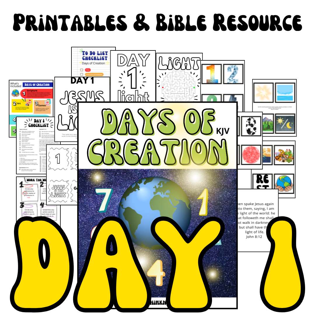 Discover the God’s Wonders in the Days of Creation:Bible for Kids Day 1 Resource. . We pray your children grow in God’s Word while they explore His world though Creation. Introduce your children to the awe-inspiring story of the Day 1 in Creation with our printable bundle. Designed to bridge the Old and New Testaments, this resource helps young minds and hearts see Jesus in creation and recognize God’s fingerprints in every aspect of His design.